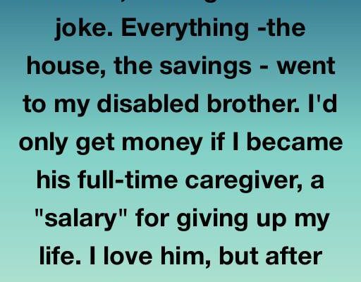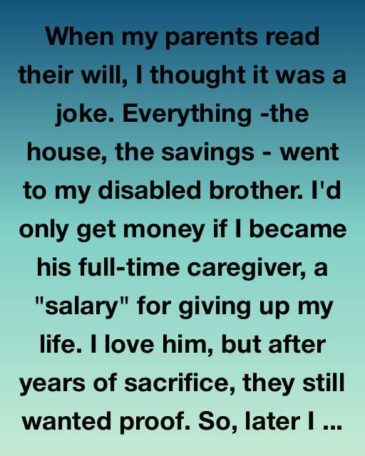 When my parents read their will, I thought it was a joke. Everything—the house, the savings—went to my disabled brother. I’d only get money if I became his full-time caregiver, a “salary” for giving up my life.