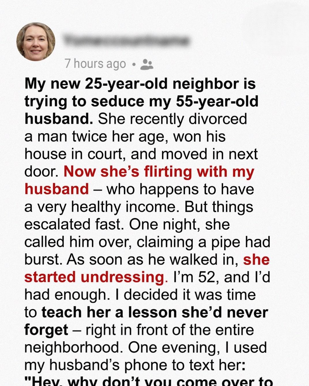 I started by casually mentioning her “overly friendly” nature to another neighbor, just a hint, a raised eyebrow, a sigh about “some people having no boundaries.” I’d make sure to be seen doing things with my husband publicly, displaying an exaggerated affection I no longer felt, just to prove a point. But that wasn’t enough. I needed something decisive. Something that would make her retreat, humiliated.