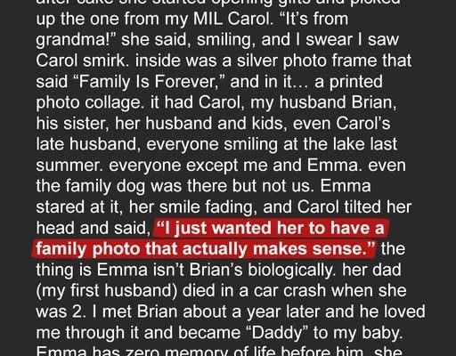 The silence stretched, thick and suffocating. My MIL, ever so calm, took another sip of her tea. “Oh, darling,” she said, without even looking at my daughter, “that was a photo from our family trip. You know, just the original gang. Not everyone could make it, of course.” She waved a dismissive hand.