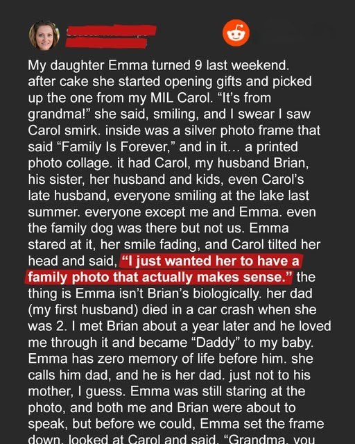 My breath caught in my throat. It was as if someone had punched me. No, no, she didn’t just do that. My daughter, still beaming, innocently said, “Oh, look, Mommy! It’s everyone!” But then her brow furrowed. She looked at the photo, then at me, then back at the photo. Her smile faltered. “But… where are we?”