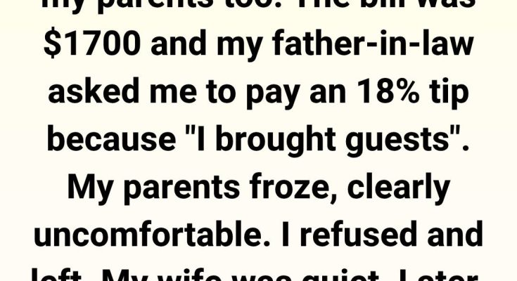 My father-in-law didn’t just tell me to cover the tip for bringing guests. He orchestrated a lifetime of lies. And what happened next wasn’t just my family being shattered. It was my entire world, obliterated by a secret he helped keep for years.