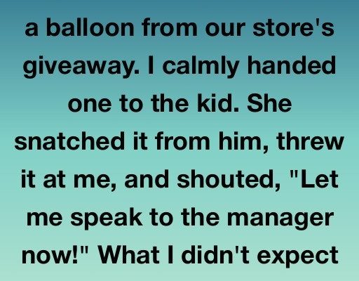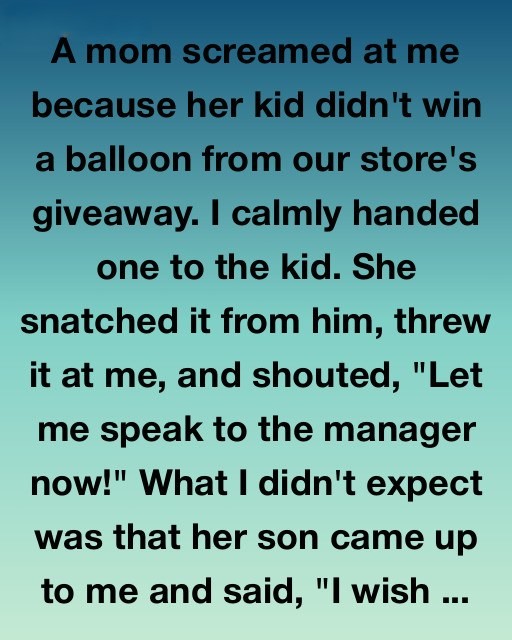 A mom screamed at me because her kid didn’t win a balloon from our store’s giveaway. I calmly handed one to the kid. She snatched it from him, threw it at me, and shouted, ‘Let me speak to the manager now!’ What I didn’t expect was that her son came up to me and said, ‘I wish you were my mom.’I stood there, stunned.