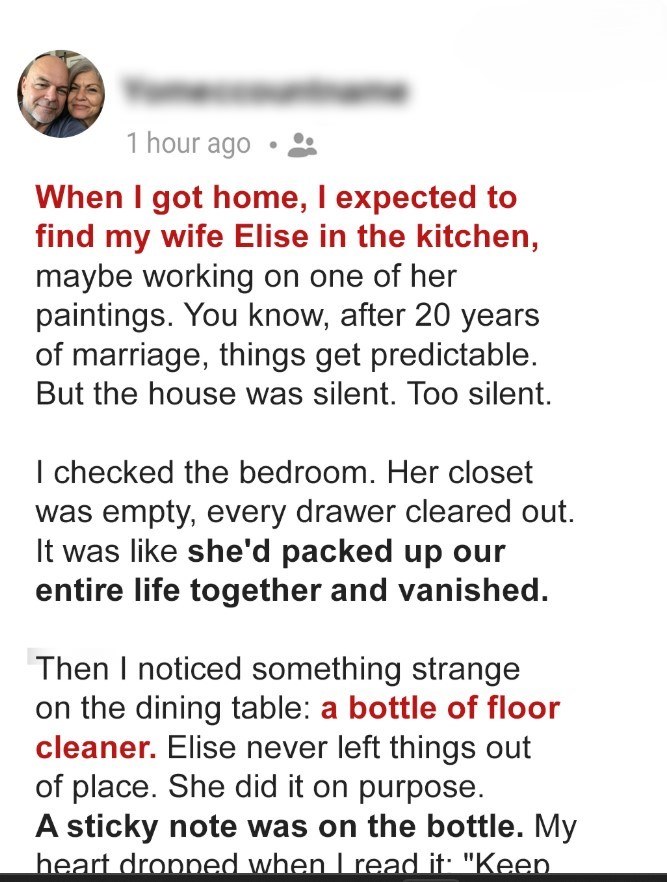 Twenty years. Ended. In a single night. Just like that. The words blurred. My vision swam. All she left behind was a bottle of floor cleaner and a note.