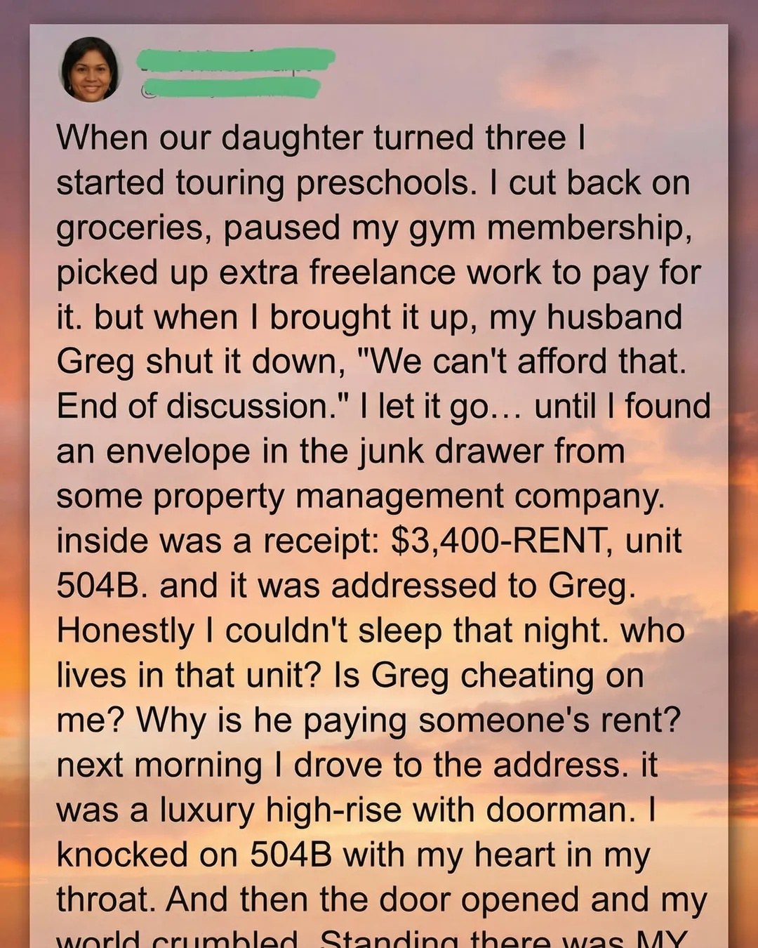 The air left my lungs in a ragged gasp. My head spun. The room started to darken around the edges. It wasn’t a relative. It wasn’t a cousin. The age of the child in the photo… they looked to be about eight or nine. The math clicked into place, brutally. This child would have been born before we met. Before our child. Before our life together. HE HAD ANOTHER CHILD. A child he had kept a secret. A child he was SECRETLY PAYING FOR TO ATTEND A PRESTIGIOUS PRIVATE SCHOOL while our child was denied basic preschool.