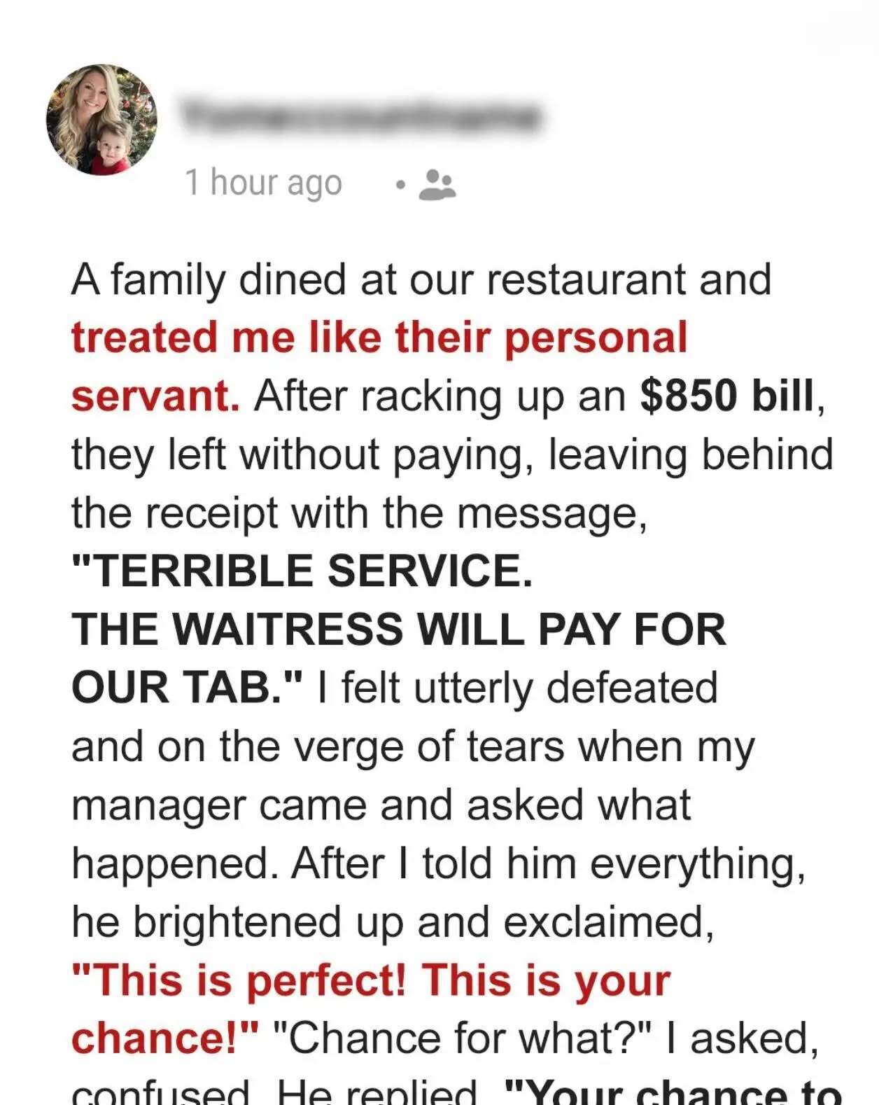 A family complained about my service and walked out of the restaurant without settling an $850 bill — but I managed to turn the situation to my benefit