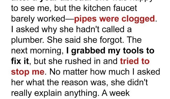 And she had never, ever wanted me to find out.It started innocently enough, like most nightmares do. A simple clogged kitchen sink. Annoying, sure, but nothing I hadn’t dealt with a hundred times. I’m a pretty handy person, always have been. Grew up in a house where you learned to fix things yourself, or you did without. So when the water started backing up, a thick, greasy film coating the ceramic, I sighed, grabbed my toolbox, and headed under the sink.