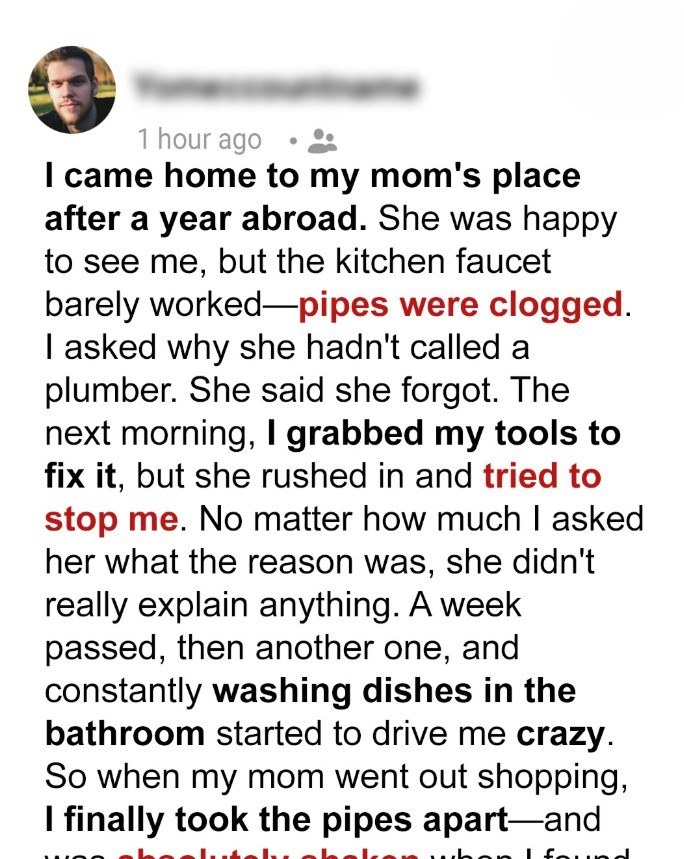 My mom refused to let me fix the clogged kitchen sink pipes, and what I eventually found inside left me speechless.