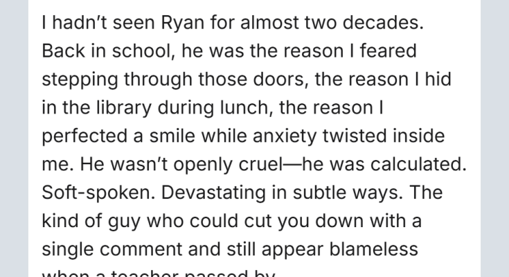 Maybe that instinct came from high school. I’d learned early how to brace myself—before entering rooms, before hearing my name, before opening my locker to discover another cruel note. There were no bruises, no shoves. Just the kind of cruelty that empties you slowly. And Ryan had been at the center of it.