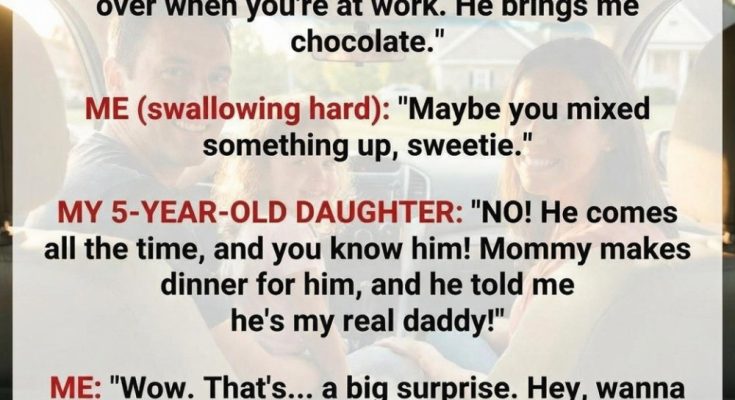 My grip tightened on the steering wheel, though I forced a light laugh and asked her what she meant. Lily, only five years old, kicked her feet happily and explained that a man came over sometimes when I was at work. He brought her chocolate. He sat with Mommy while they talked. Mommy cooked for him. And he told Lily that he was her “real daddy.” My chest felt tight, but I kept my voice calm, suggesting she might be confused or imagining things. Lily shook her head firmly, her certainty unsettling. That night, sleep wouldn’t come. I lay awake replaying her words, caught between disbelief and a growing fear that something was terribly wrong.