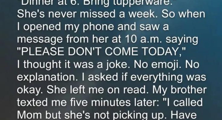 Every Sunday, my mom sends a message in the family group chat: “Dinner at 6. Bring Tupperware.” She’s never missed a week. So when I opened my phone and saw a message from her at 10 a.m. saying “PLEASE DON’T COME TODAY,” I thought it was a joke. No emoji. No explanation. I asked if everything was okay. She left me on read. My brother texted me five minutes later: “I called Mom but she’s not picking up. Have you talked to her?” I hadn’t. We became worried and rushed to Mom’s house. I arrived first and knocked. No one answered. I had a spare key, so I opened the door, rushed inside.