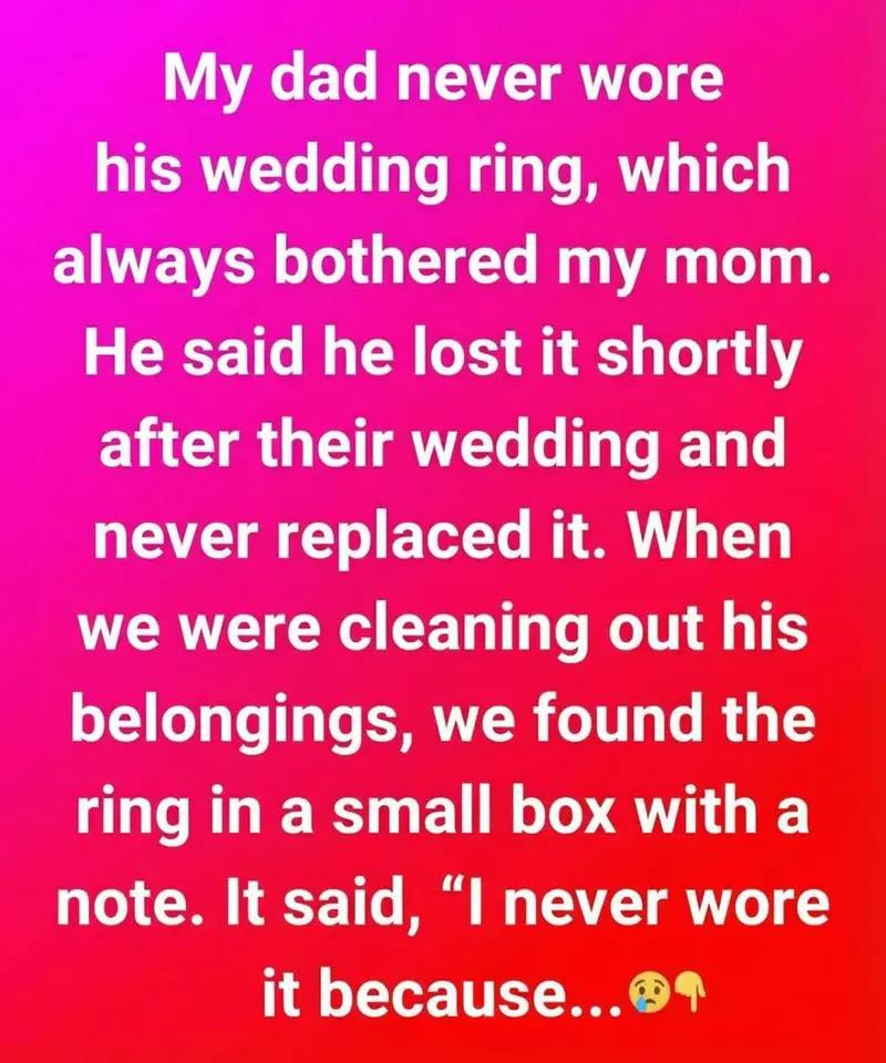 My dad never wore his wedding ring. Not once. It was a constant, silent ache in our home, a low hum of unspoken tension that vibrated just beneath the surface of every family dinner, every holiday photo. My mom, bless her heart, tried to pretend it didn’t bother her. But I saw the way her eyes would flicker to his bare left hand, just for a second, before she’d quickly look away, a small, involuntary sigh escaping her lips.