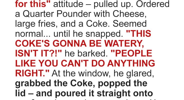 “Pathetic! This already looks watery. You people can’t even get soda right. Honestly, if you can’t handle a Coke, you don’t deserve to work here.” He sneered, climbed back into his car, and peeled out of the lot like nothing happened.