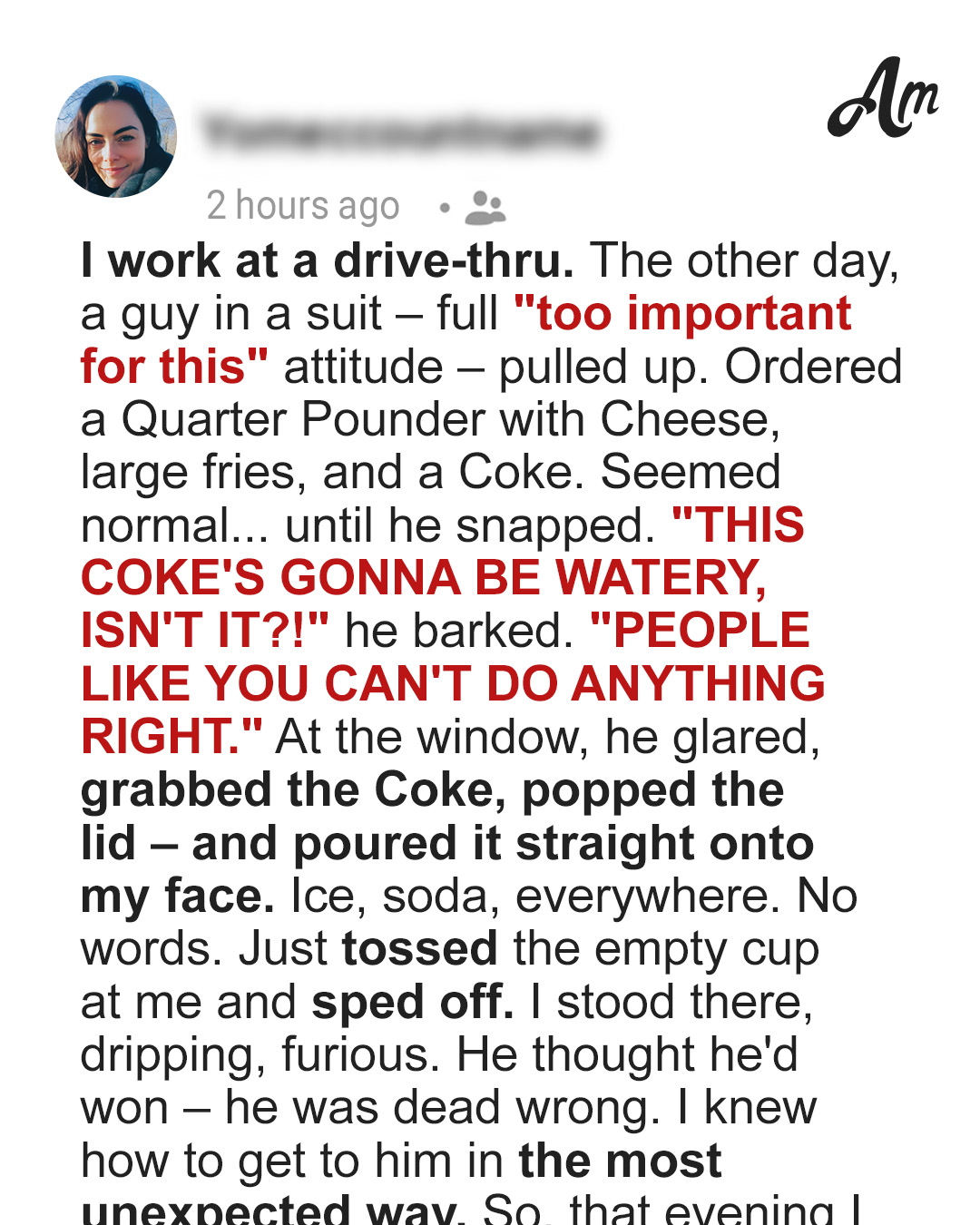 An entitled customer rolled up to the drive-through and ordered food like he owned the place. Then he humiliated me in front of my coworkers and poured Coke in my face before fleeing in his fancy car. What happened next was unforgettable… because I made sure he regretted every second.