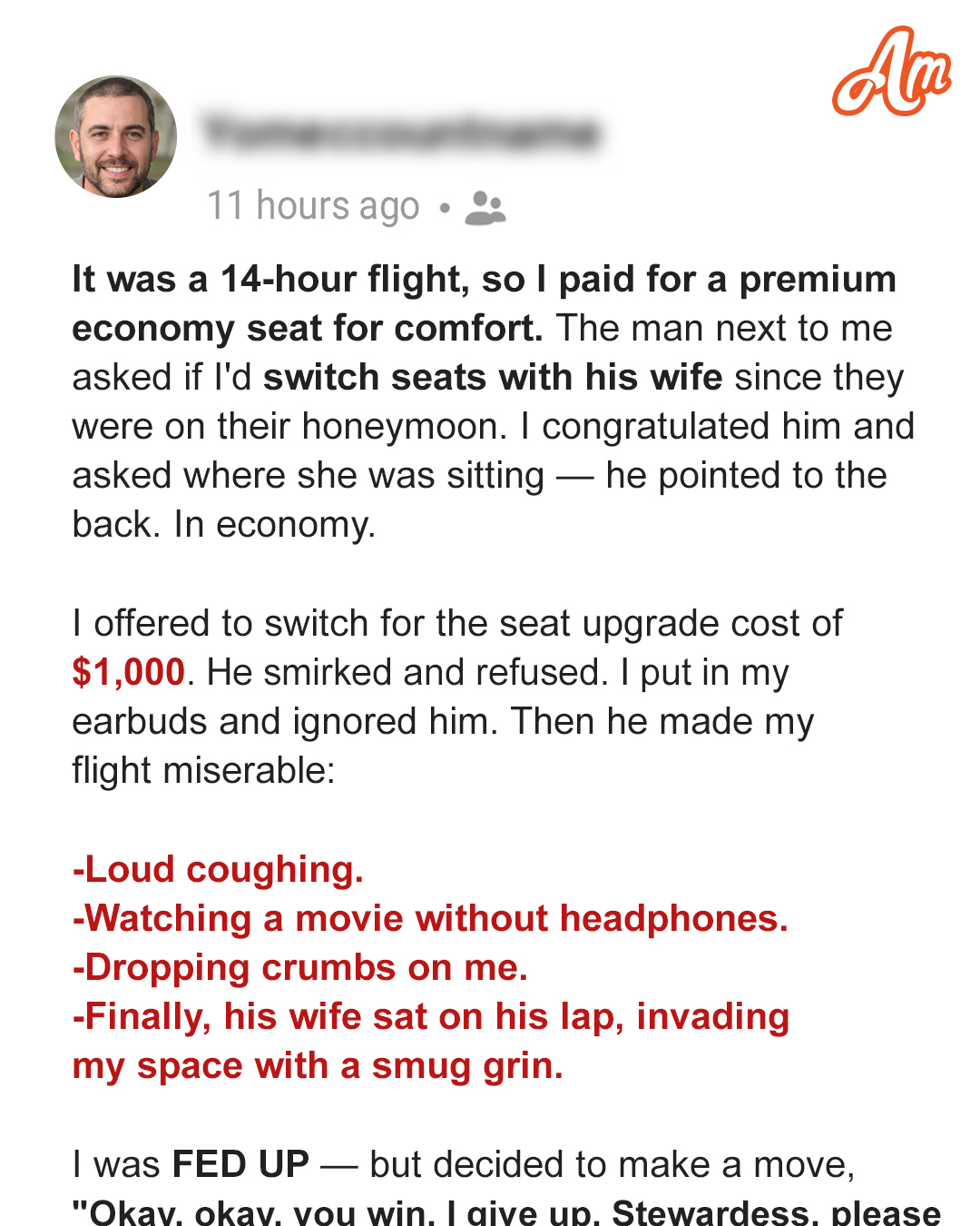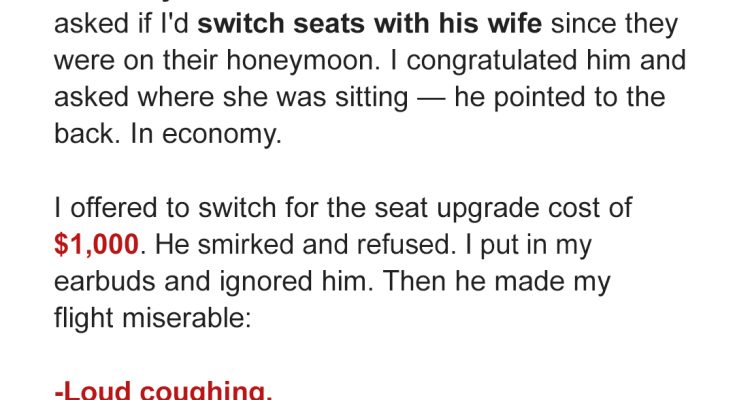 I’d splurged on a premium economy seat for this 14-hour journey. Honestly, when you’re staring down the barrel of that many hours in a metal tube, every extra inch of legroom counts.As I settled in, feeling pretty good about my decision, the guy next to me cleared his throat.“Hey there,” he said, flashing a grin. “I’m Dave. Listen, I hate to ask, but would you mind switching seats with my wife? We just got married, and, well… you know.”
