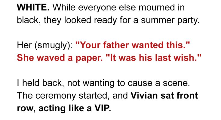She cut me off, reaching into her designer handbag and pulling out a neatly folded envelope. “He wrote me a letter,” she said, holding it out as if it explained everything. “Told me, ‘Vivian, you and the kids are to wear white. It’s my last wish.’”