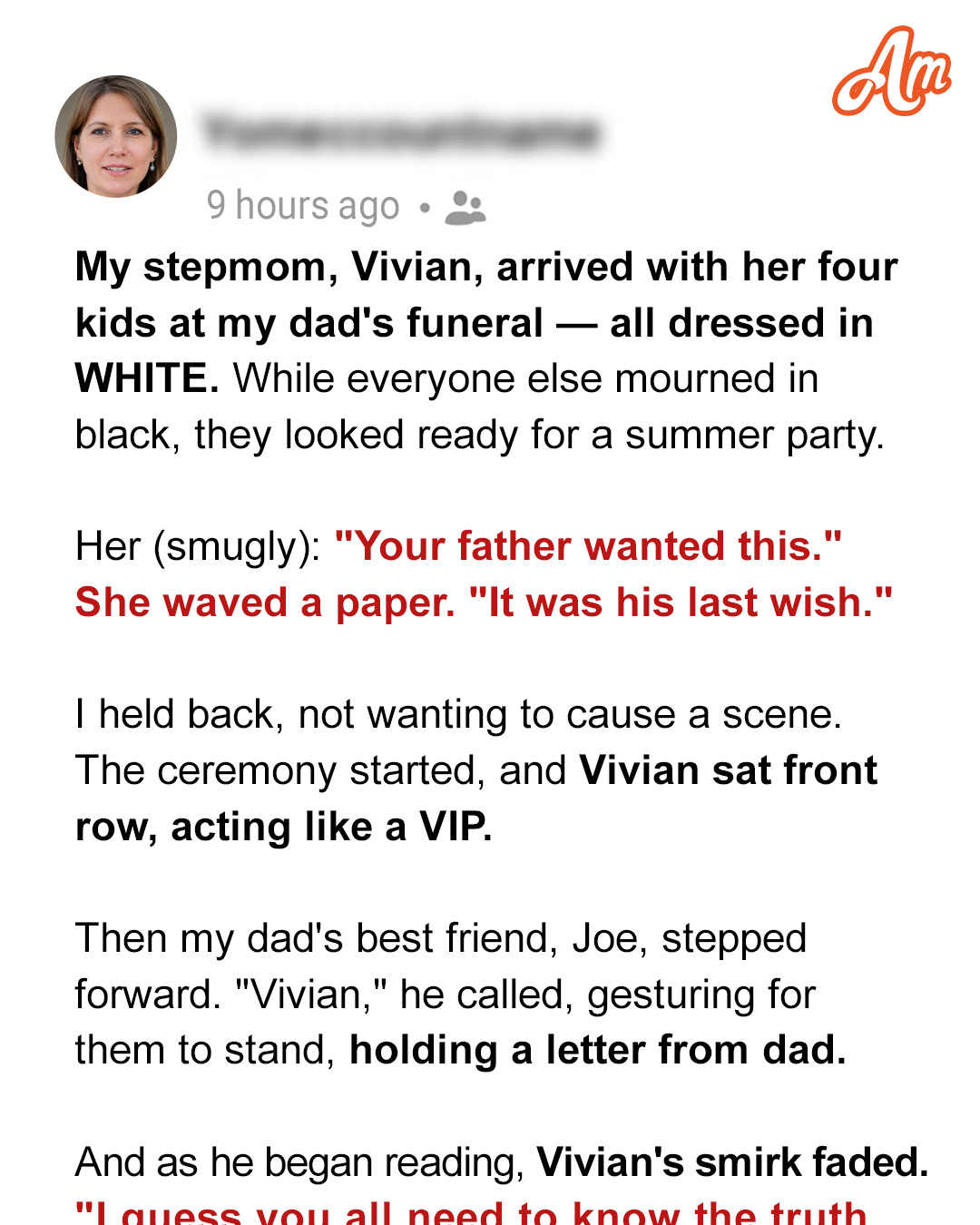 And then they showed up.Vivian, my stepmom, waltzed in like she was on a runway, her four adult kids trailing behind her, all dressed in white. Stark, glaring white — like they’d gotten lost on the way to a fancy yacht party.Everyone else was draped in black, heads bowed, grieving. But not them. No, they strutted in like they were attending some exclusive event, turning heads for all the wrong reasons.