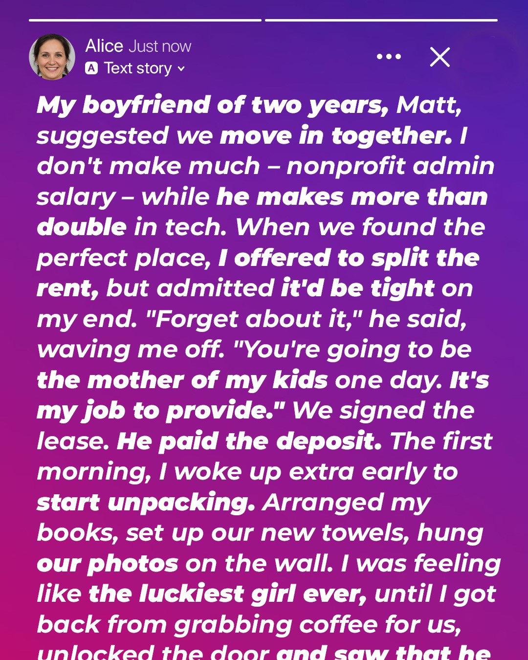 When my boyfriend Matt suggested we move in together, I thought it was the start of a dream.We’d been dating for almost two years, and taking this next step felt right. Like we were building something real together.“Think about it, Alice,” he said one night as we sat on the couch. “We practically live together anyway. Why pay for two places?”He was right. Most of my things had already migrated to his apartment, including my favorite coffee mug, half my wardrobe, and even my collection of true crime books that he teased me about but always made room for on his shelf.