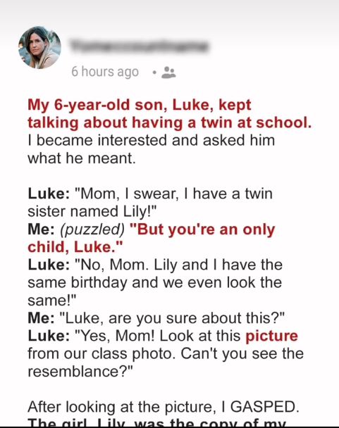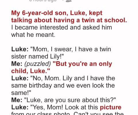 Luke was sitting in the kitchen across from me, eating a peanut butter and jelly sandwich while I prepared dinner, working in between.“Mom,” Luke said. “I swear…”“What did we say about swearing?” I asked him.Luke chuckled.“Mom,” he dragged on. “I’m telling you, Luna is my twin sister!”My son’s declaration caught me completely off guard.“Luke,” I said, masking my confusion with a smile. “You’re an only child, honey.”