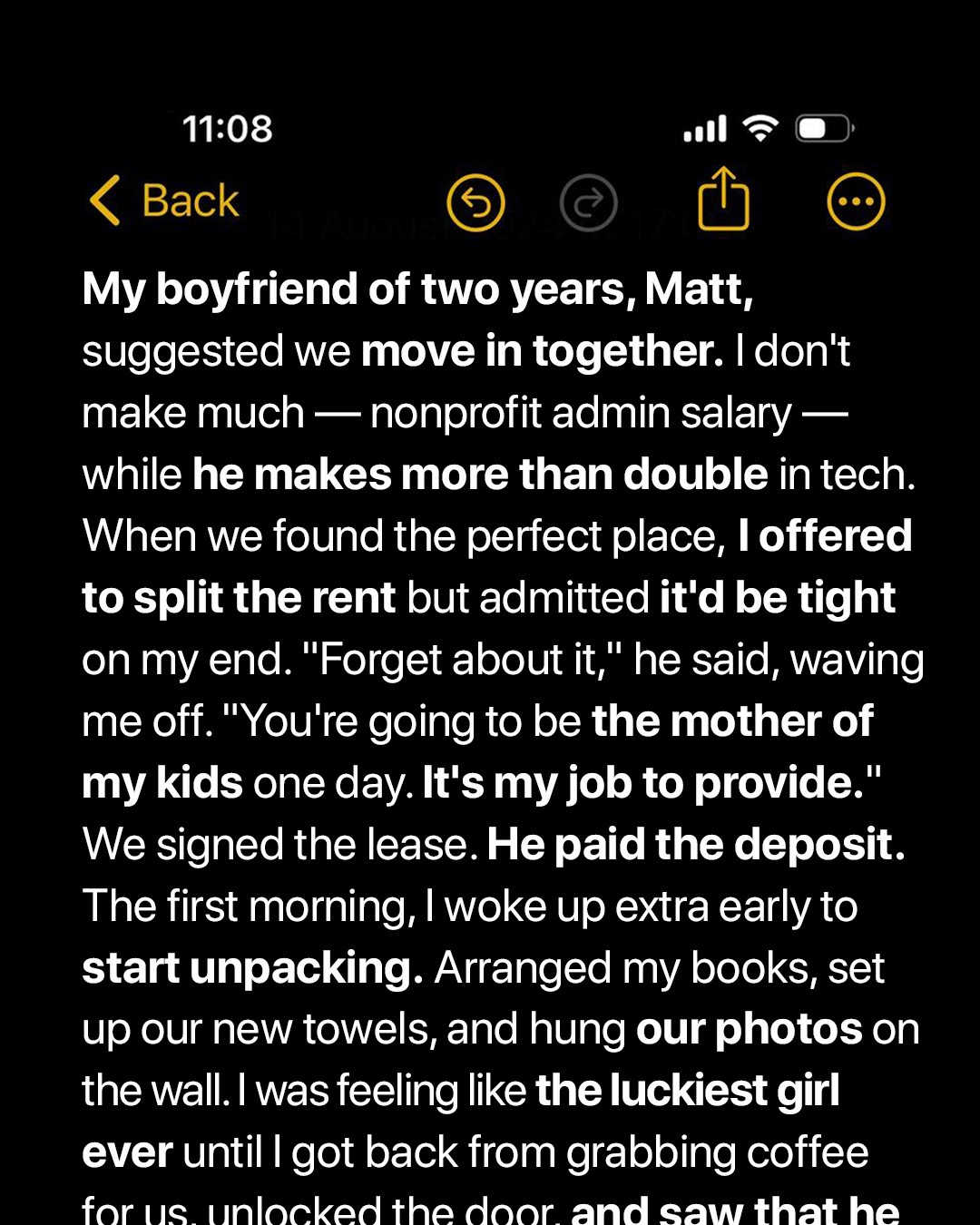 There’s something intoxicating about someone wanting to provide for you. It blinds you to the fine print they’ve hidden in their generosity.When my boyfriend Matt suggested we move in together, I thought it was the start of a dream.We’d been dating for almost two years, and taking this next step felt right. Like we were building something real together.“Think about it, Alice,” he said one night as we sat on the couch.