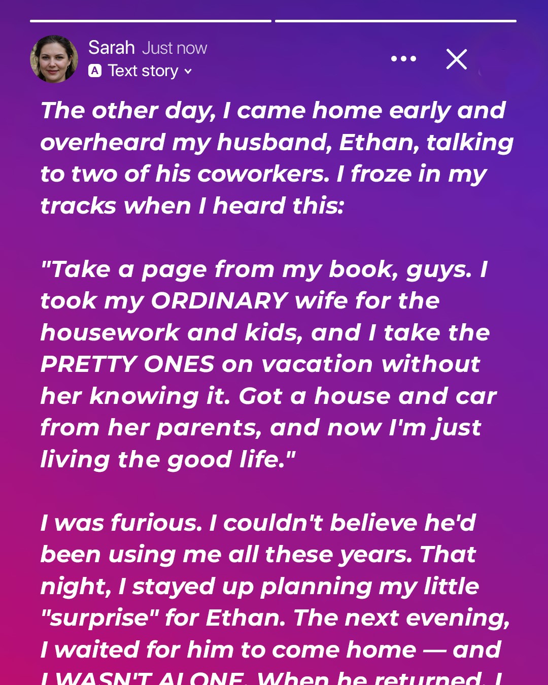 When Sarah gets home from the usual errands with her kids, the last thing she expects is to hear her husband spilling his true feelings about her — that she is just a means to an end in his life. But Sarah isn’t about to let Ethan get away with his callous behavior. Instead, she decides to teach him a lesson.They say marriage is built on love, trust, and respect. I thought I had all three with Ethan. For seven years, we shared a home, two kids, and what I thought was a good life.
