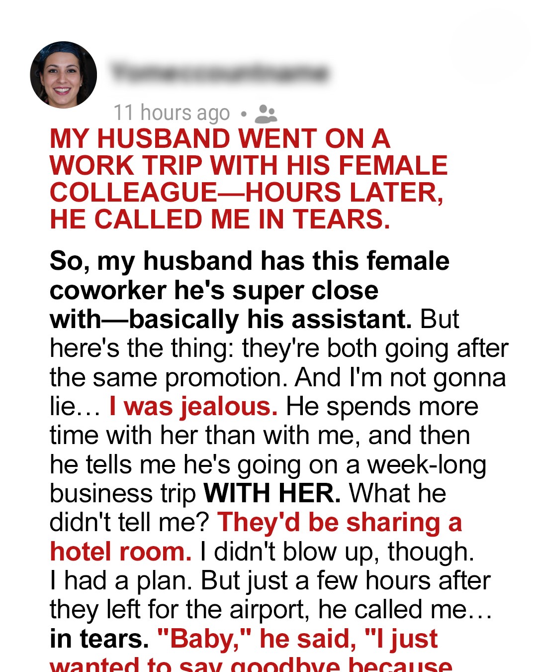 So when Cameron came home one evening and casually mentioned he’d be going on a four-day business trip with Lucy, I felt it. That slow sting in my gut crept up.