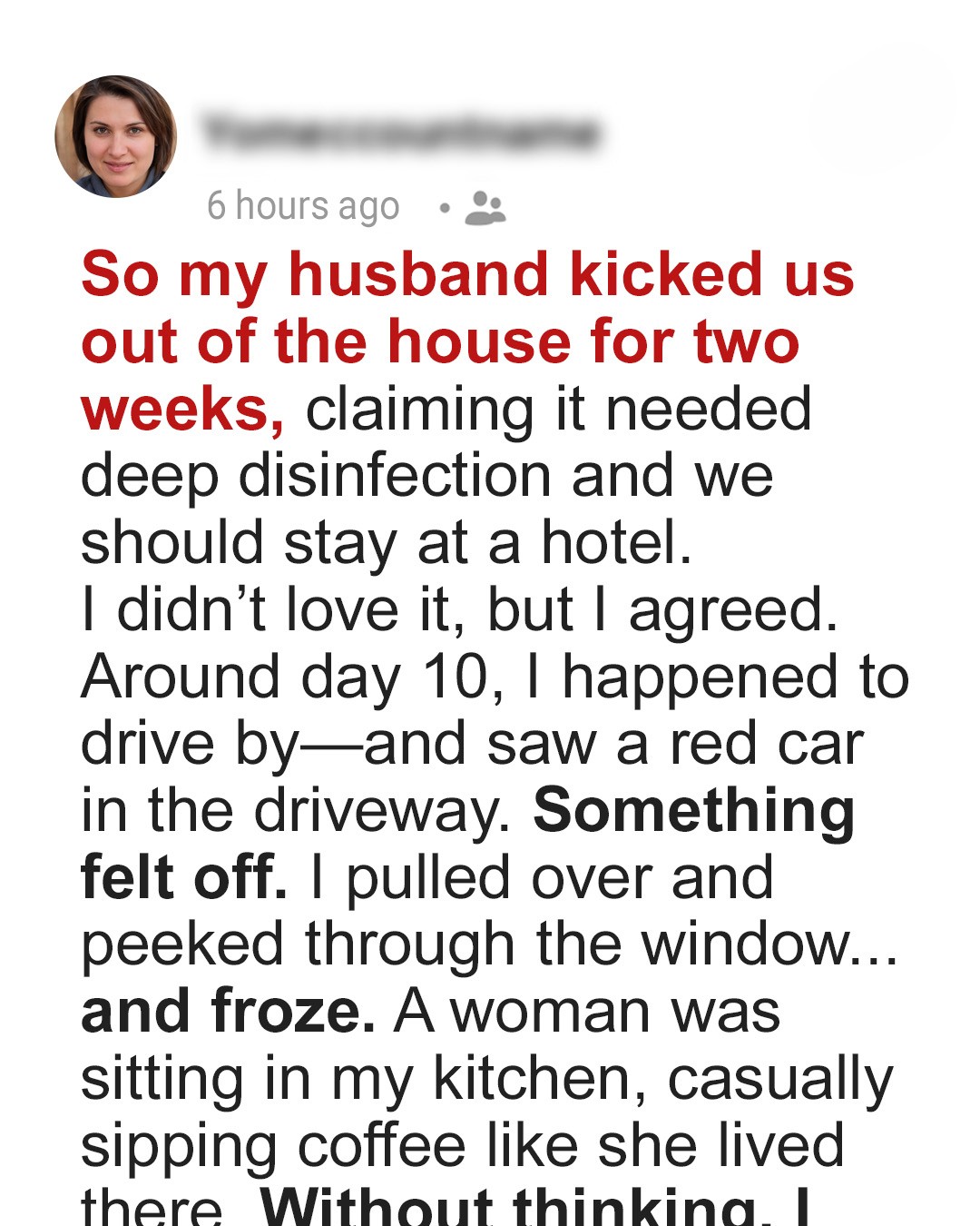 My husband sent me and the kids to a hotel for two weeks, saying the house had rats and needed disinfection. I believed him… until I drove by and saw a woman inside. I was shaken, but nothing prepared me for what he confessed next.Mark and I weren’t perfect, but we worked on us, holding it all together. We had our routines—morning traffic rants, Friday takeout, a shared Netflix account, and two little munchkins, Emma and Noah, four and six… who still believed their dad could do no wrong.I raised an eyebrow. “That’s… surprisingly proactive of you.”