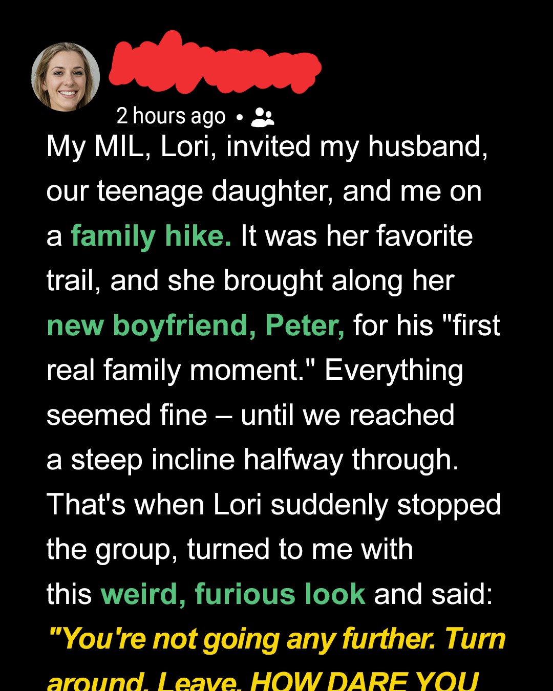It was supposed to be a peaceful family hike. One of those “early start, sun on your shoulders, forget-the-city” kind of mornings.My mother-in-law, Lori, invited us to join her on a trail she adored.“I hike it often!”“It honestly has the best views at the top!”So, that morning, my husband, Ben, our teenage daughter, Penny, and I got dressed for a morning in nature.