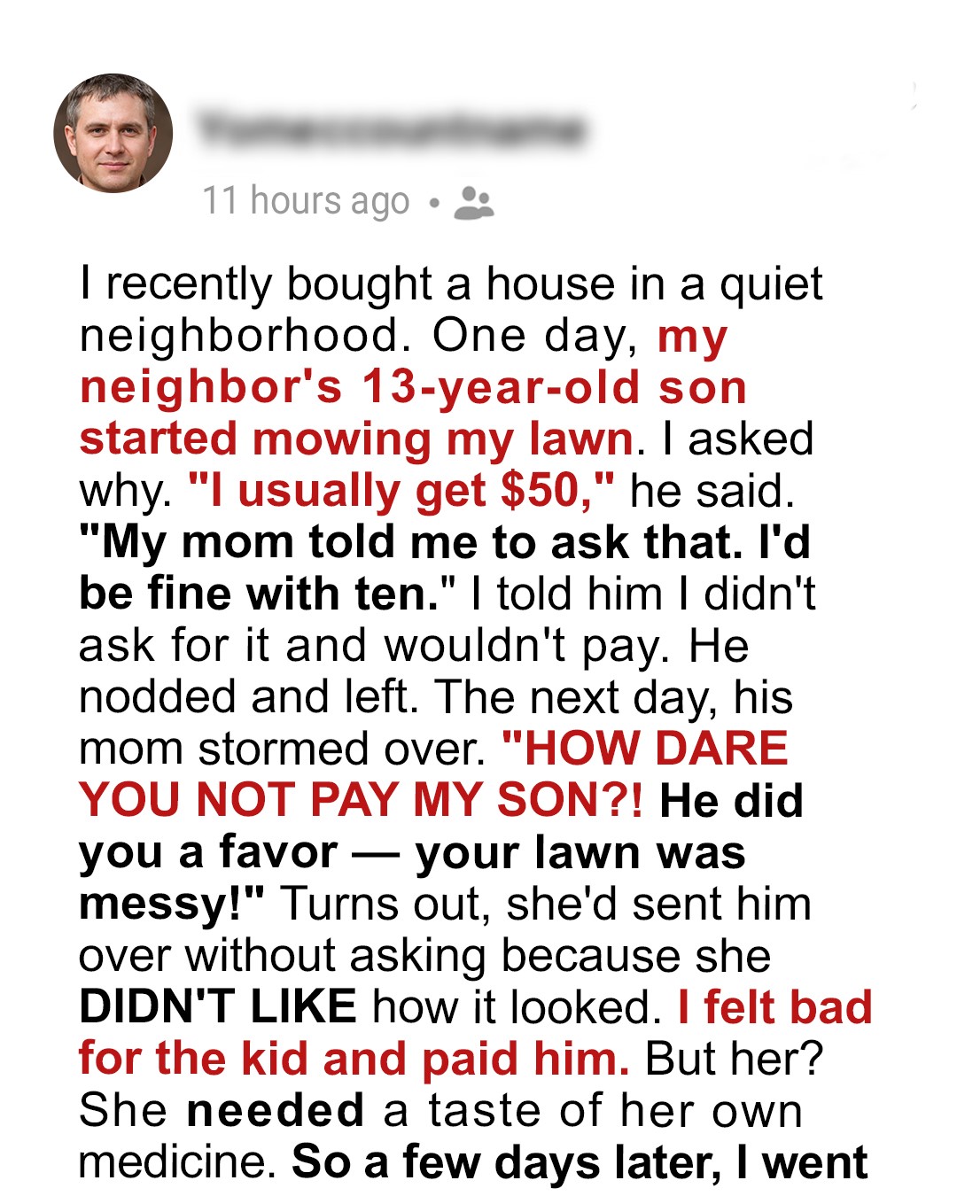 Homeownership is an American dream… until your neighbor thinks your lawn is her business. Mine sent her son to mow it without asking, then demanded $50. I refused and gave her a taste of her own logic… because some lessons hit harder when the mirror turns back on you.The late afternoon sun beat down on my neck as I pulled into the driveway of my new home. Twenty-nine years old and finally a homeowner. What a milestone! The modest two-bedroom in Oakridge Estates wasn’t much, but every mortgage payment, every creaky floorboard, and every blade of grass was… mine.