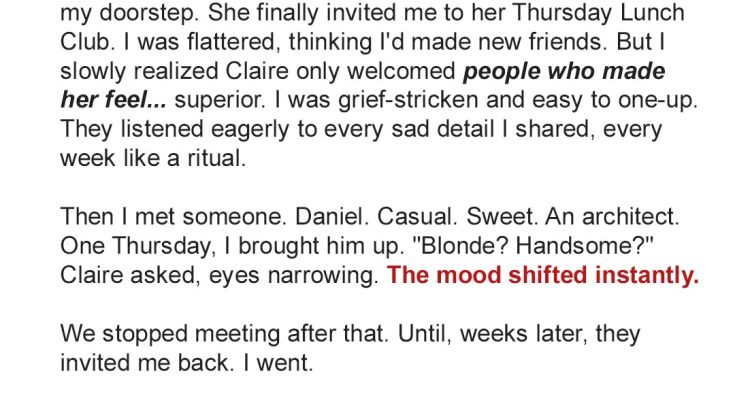 Messages left on read. Invitations that didn’t come. The next Thursday, they “forgot” to tell me that lunch was canceled. Claire’s silent decree rippled outward. The others followed.