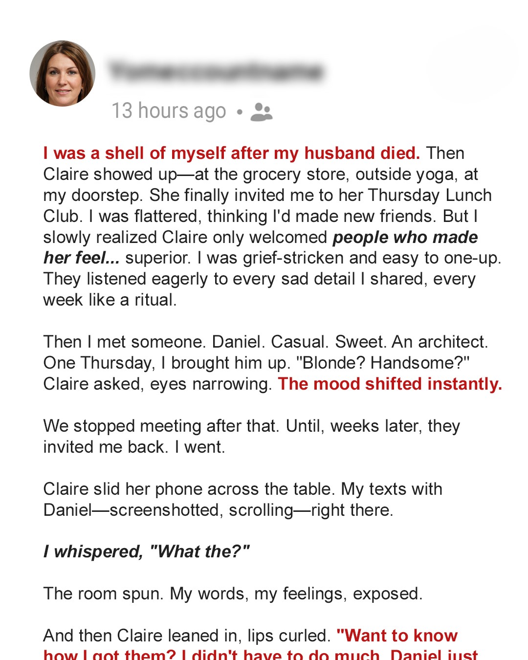 I learned the rules quickly. Smile. Laugh. Don’t outshine anyone. Especially Claire.I was the outsider. The widow. New blood dragged into their orbit not because I fit but because grief makes you cling to anything. Even strangers.Even sharp-edged women who looked at me like I was something fragile they couldn’t quite trust not to shatter.Claire found me after Phil’s funeral. She appeared everywhere.Everywhere.