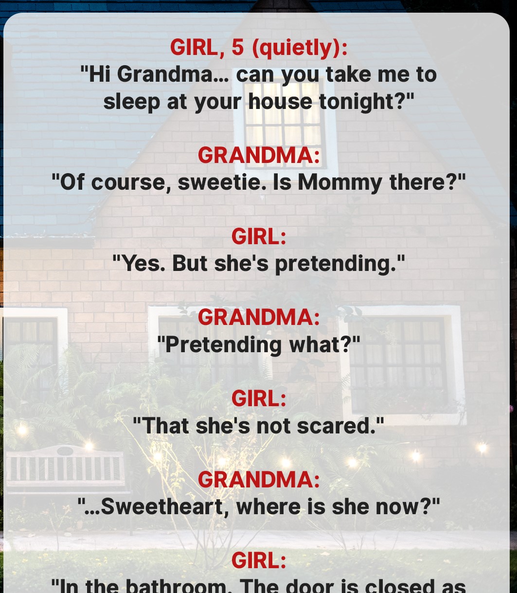 My granddaughter never calls me on her own. When her tiny voice whispered that her mom was “pretending not to be scared,” I knew something was wrong. What I found when I got there left me frozen in the doorway, heart racing.“Hi Grandma… can you take me sleep at your house tonight?”I froze.Lila’s voice was soft. Too soft. She never whispered like that.She’s five. Full of giggles and wild stories. Blonde curls that bounce when she runs. Big blue eyes. Missing front teeth. Always talking about unicorns, dragons, or space pirates.
