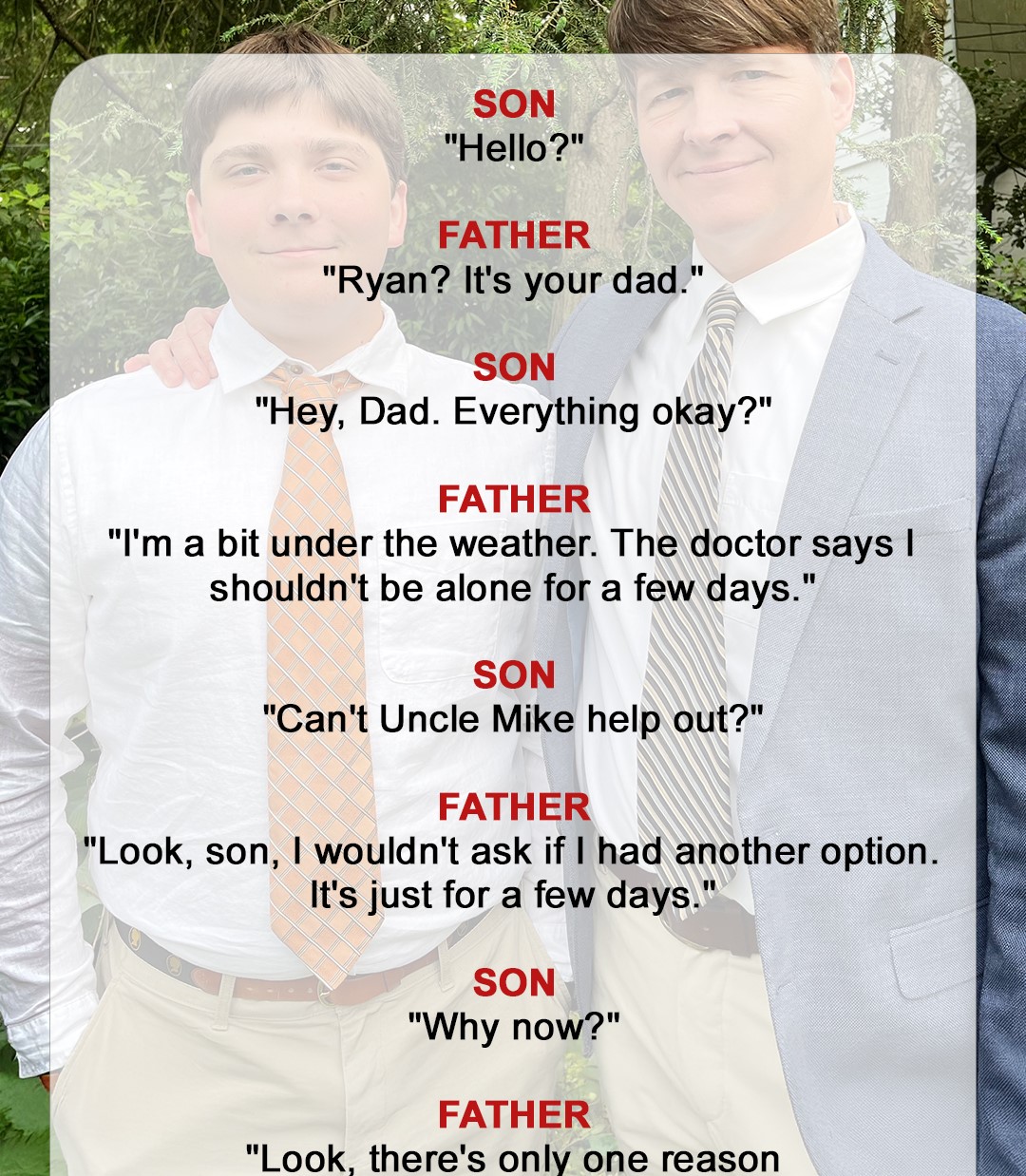 “Not really,” his father, Larry, replied, and something in his voice made Ryan stand straighter. “I’m a bit under the weather. Nothing serious,” he added quickly, “but the doctor says I shouldn’t be alone for a few days.”