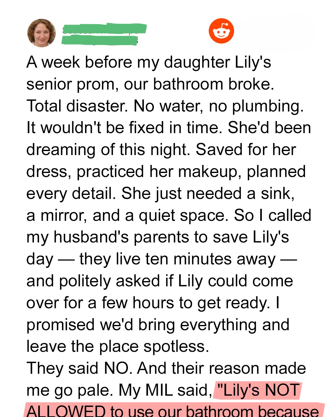 It started the week before Lily’s senior prom — the night she’d been dreaming of for months. Her dress was perfect, but her hair tutorial skills? Top-notch. Everything was ready… until a leaking pipe turned our only bathroom into a swampy disaster zone.
