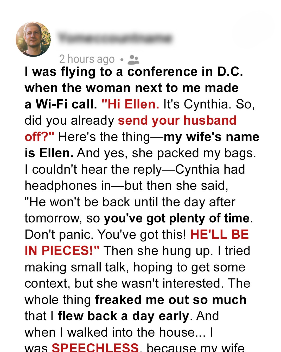 On a flight to D.C., a husband overhears a chilling call: “Did you send your husband off?” followed by, “He’ll be in pieces.” The caller? A stranger. The name she used? His wife’s. Panic takes hold — what is Ellen hiding? He flies home early… and what he finds leaves him speechless.I was settling into my aisle seat when the woman in 12B said my wife’s name during her phone call.