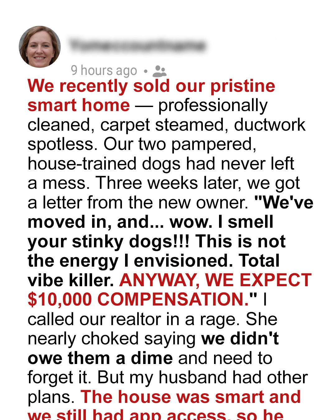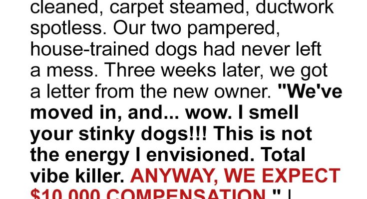 Every dog lover needs to read this. After selling our sparkling clean home, we thought we’d closed the chapter with grace… until a letter arrived from the new homeowners, accusing our “stinky” dogs of ruining their carpet and demanding $10K compensation. My husband and I had other plans.