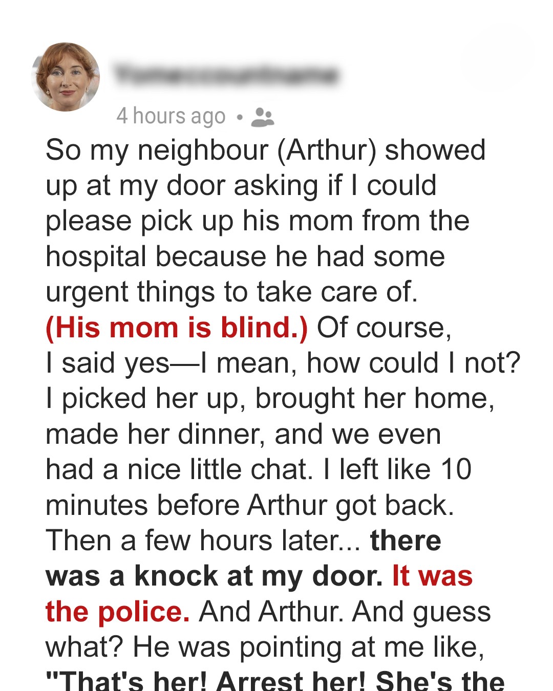 Sometimes, kindness gets punished in ways you don’t see coming. I learned that the hard way when I agreed to help my neighbor. I picked up his blind mother from the hospital, never imagining that my good deed would end with police officers in my living room… accusing me of something I didn’t do.