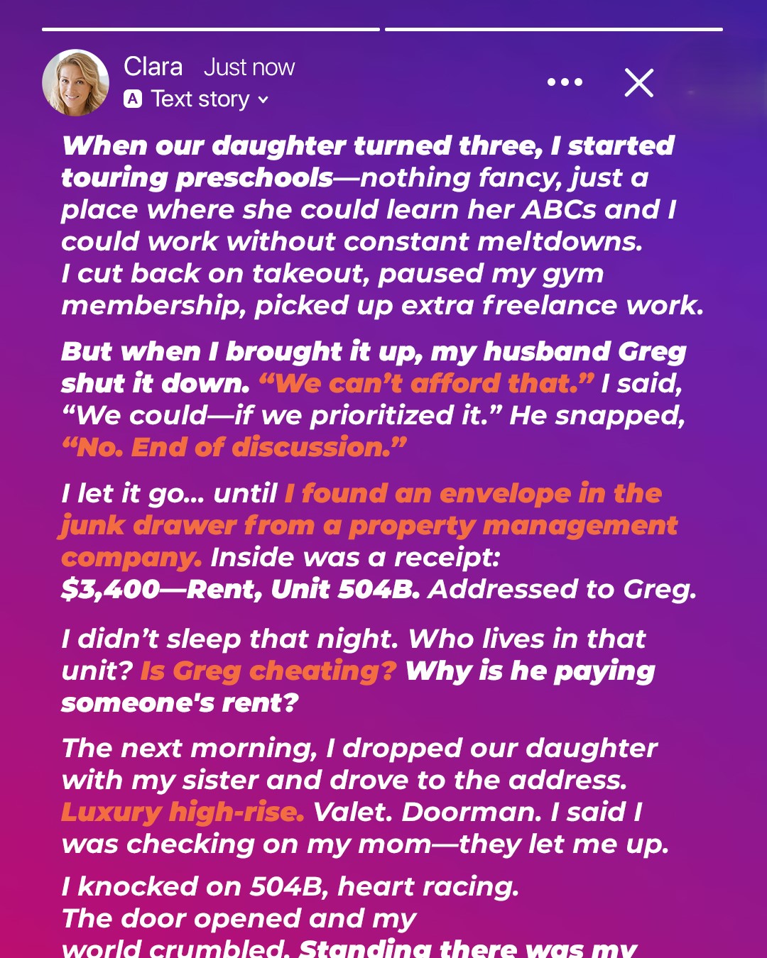 “You lied to me. You looked me in the eye and said we couldn’t afford preschool for our daughter while secretly paying $3,400 a month for your mother to live like a queen.”