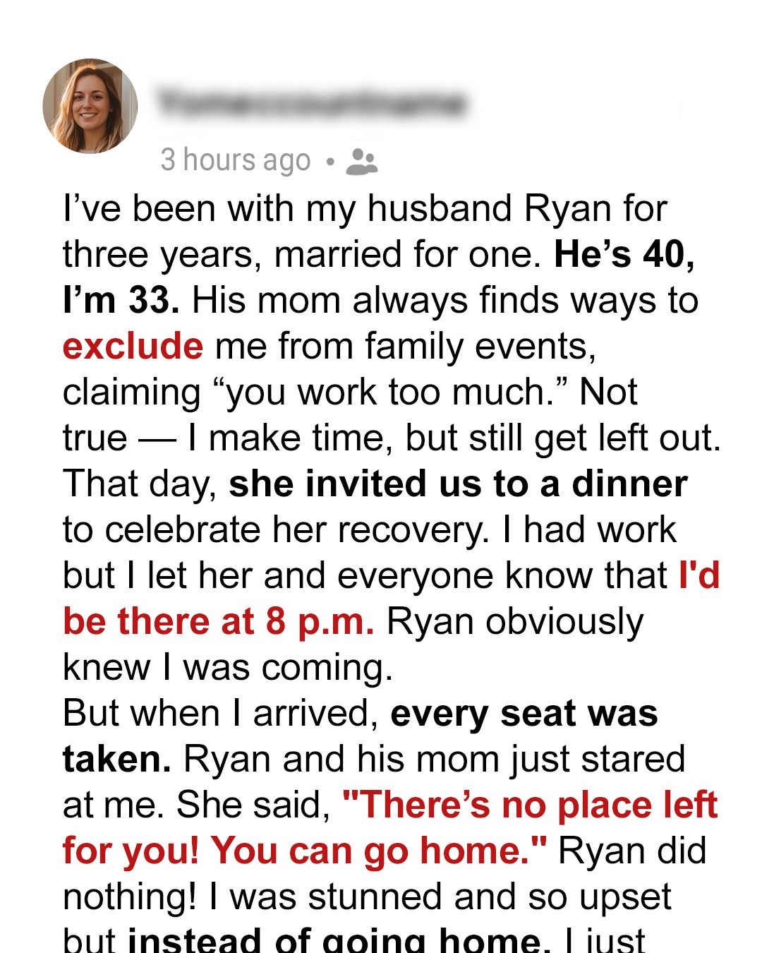 There would be no seat for me. No explanation.Just, “You work too much, Kira.”I made time. Every single time I was actually told about an event, I made time.But apparently, being a corporate attorney with a brain and a backbone meant I wasn’t “family enough.”Especially for my mother-in-law, Diane.Ryan never defended me. He just gave me that passive shrug, the kind that says: “Please, don’t make this a thing, Kira.”Well. It became a thing.The night that changed everything didn’t start with fireworks. It started with a text from my husband.