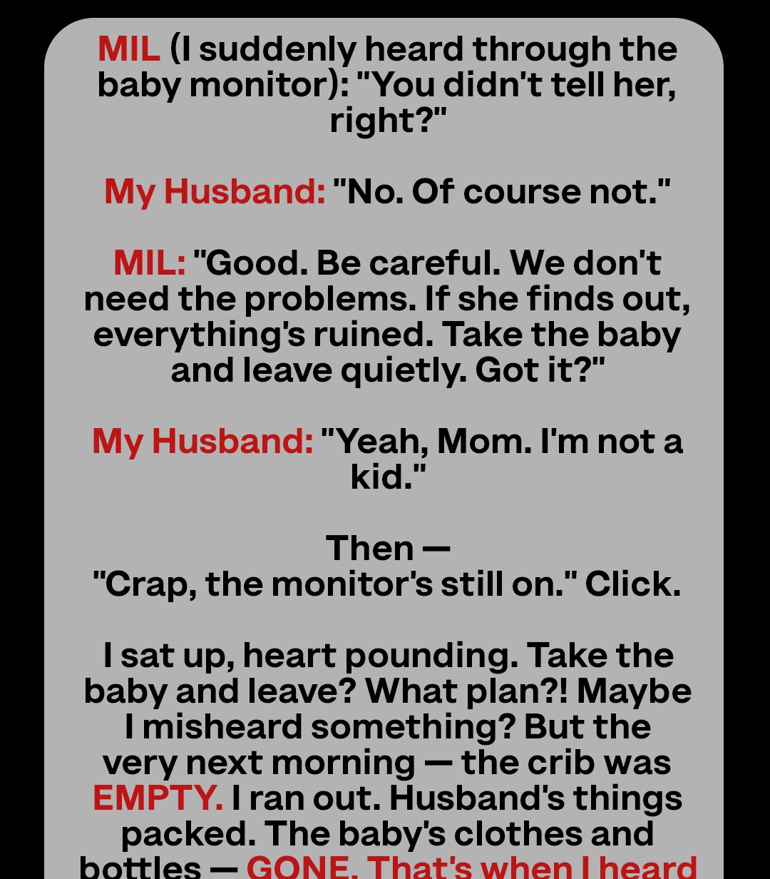 I swung my legs over the edge of the bed but stayed seated, gripping the mattress. I couldn’t storm outside. Not yet. If they were truly plotting something, I needed to understand it first. I needed to be smart, not hysterical. That’s what they’d expect, right? Me overreacting. Being the emotional, unstable new mom.