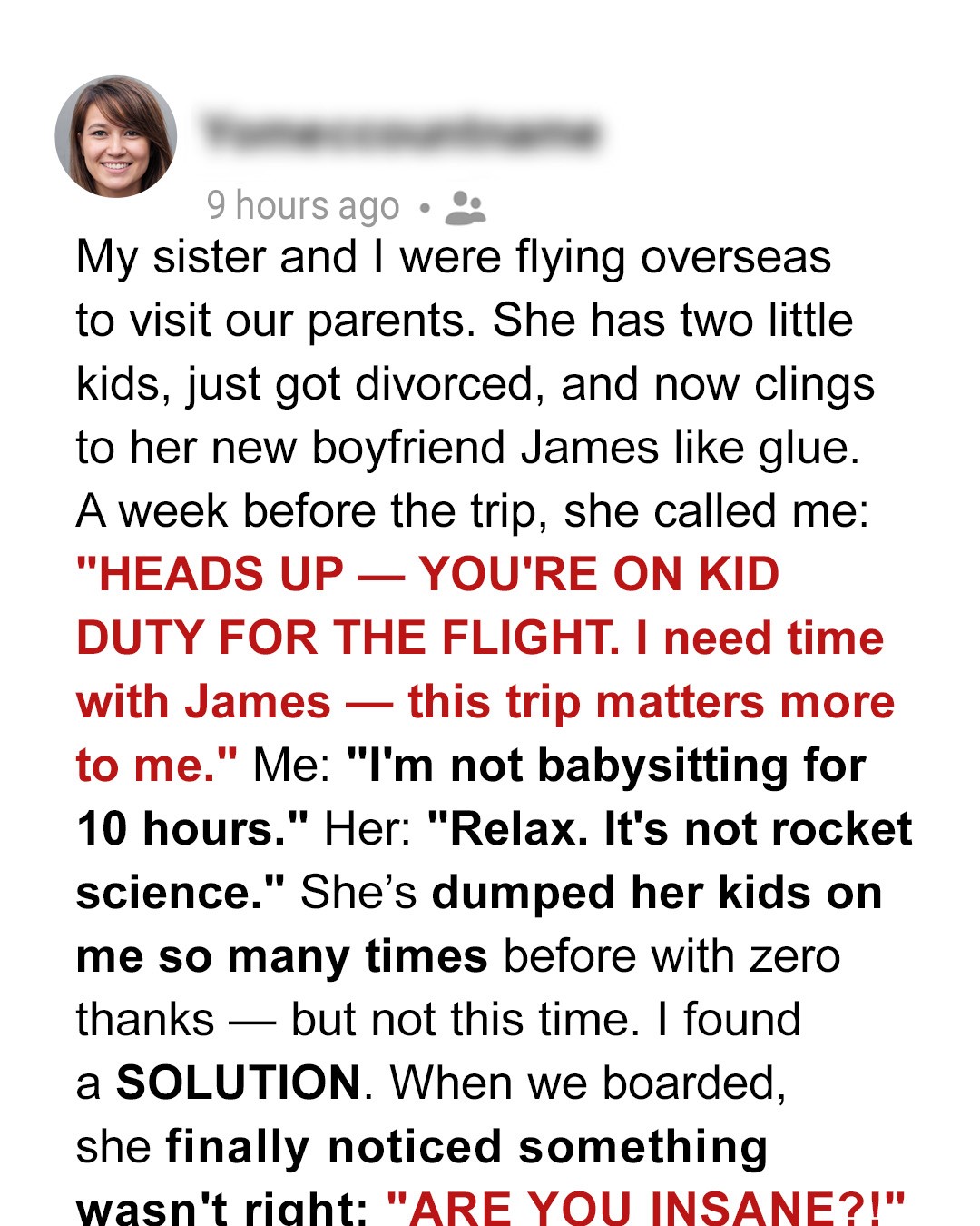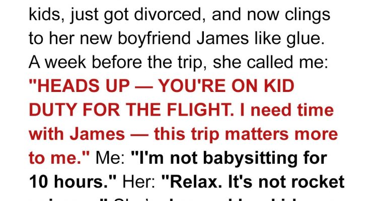 “Wait, what?”“Come on,” she huffed, “I can’t juggle them for 10 hours by myself. And let’s be real, you’ve got no one to fuss over. Meanwhile, I need actual time with James. This trip matters more to me than to you.”She didn’t wait for an answer.And that, in a nutshell, is my sister: single mom, recently divorced, emotionally attached to her new boyfriend like he’s a life raft, and somehow always the main character in every room, even on a plane.