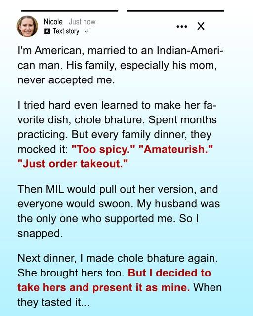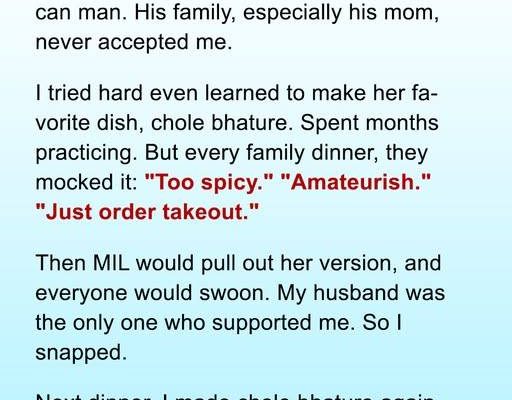Instead, the ritual would begin. My mother-in-law would take a forkful, chew thoughtfully, then her brow would furrow. “It’s… interesting,” she’d say, her voice dripping with condescension. Then someone else would chime in. “A little bland, don’t you think?” “Could use some spice.” “Too much salt.” “Not enough salt.” It was never consistent, always contradictory, always designed to make me feel inept.
