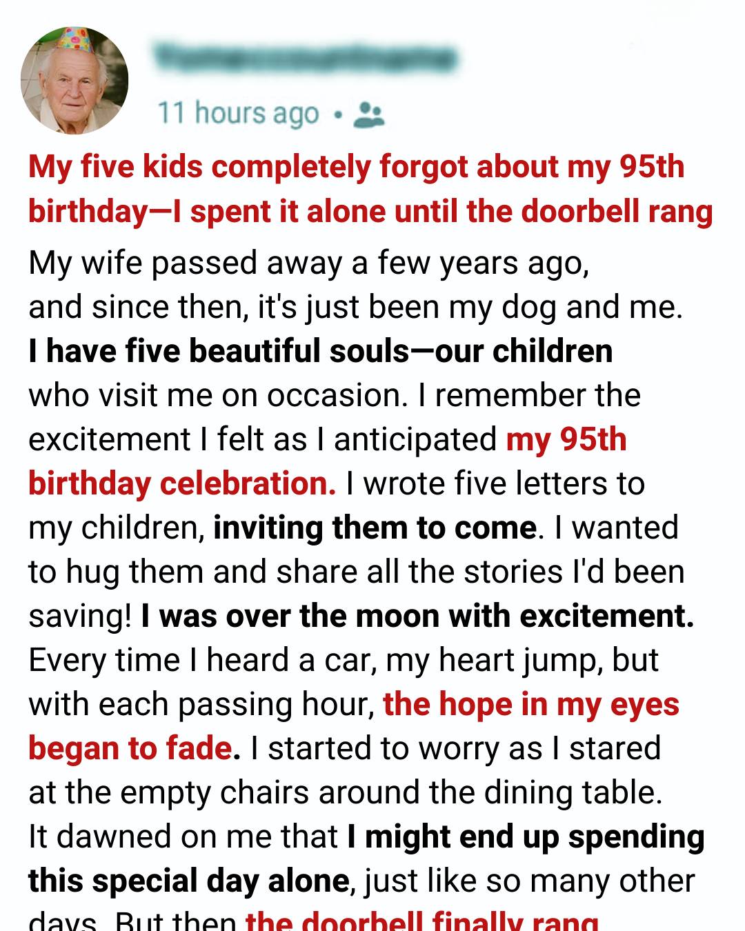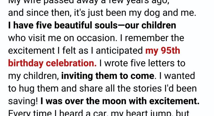 Phone calls when they remember. I don’t blame them. Life gets busy.I know that. But my ninety-fifth birthday felt different. It felt important.Weeks before the day arrived, I sat at my small wooden desk and wrote five letters—one for each child. My handwriting isn’t what it used to be, but I took my time. I told them how much it would mean to me if they could come.