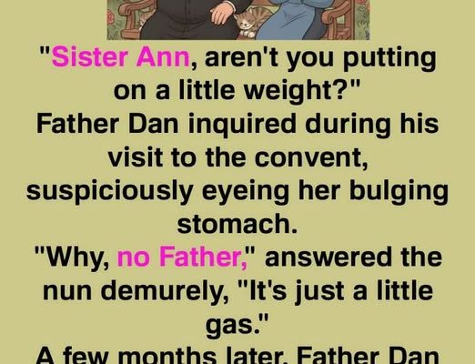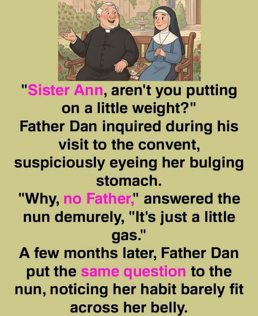 “Sister Ann, aren’t you putting on a little weight?”inquired Father Dan during his visit to the convent, suspiciously eyeing her bulging stomach. “Why, no Father,” answered the nun demurely, “It’s just a little gas.”A few months later Father Dan put the same question to the nun noticing her habit barely fit across her belly. “Oh, just a bit of gas,” said sister Ann, blushing a bit.