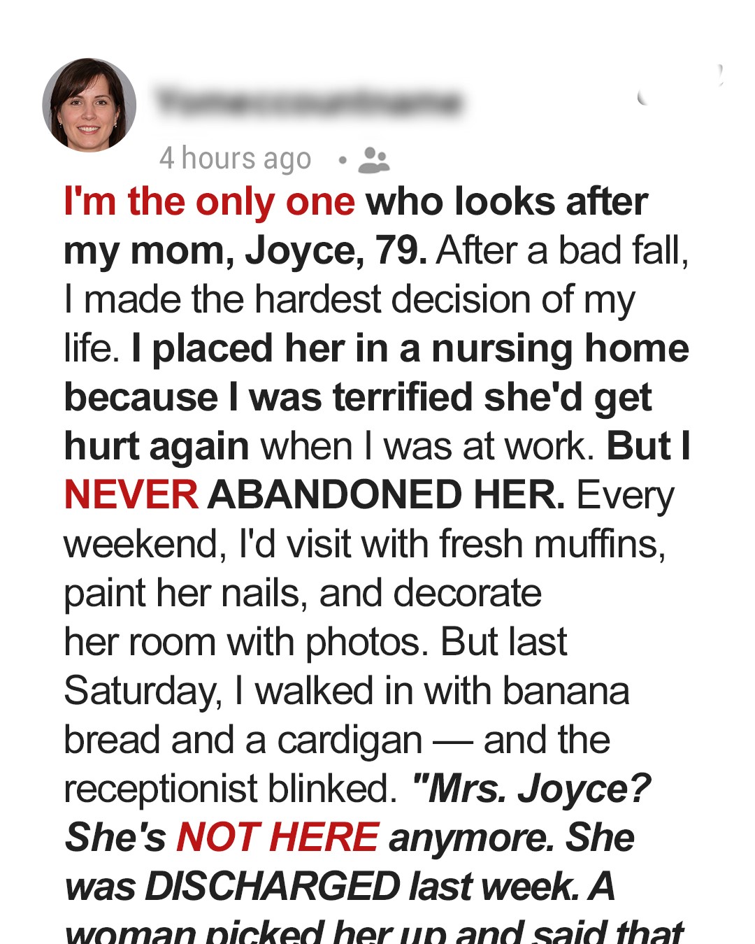 The image showed Mom staring into the camera, her gaze filled with fear and confusion. Below that was a paragraph of text that made me sick.