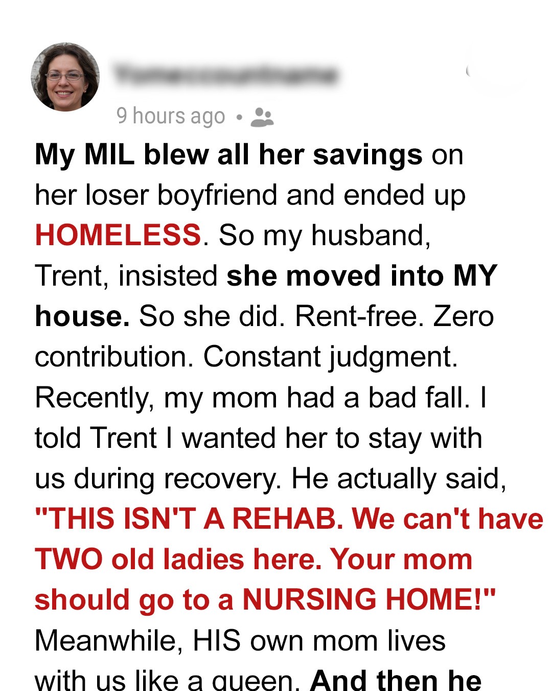 When Anna’s mother suffers a brutal fall, she expects support from her husband of 14 years. Instead, Trent coldly suggests a nursing home — while his petty mother lives in Anna’s house rent-free. That’s when Anna quietly decides: he’s about to learn a final lesson.For 14 years, Trent and I built this life brick by careful brick. No kids, just weekend gardening, quiet dinners, and those annual trips to Maine where we’d eat lobster and pretend we might move there someday.