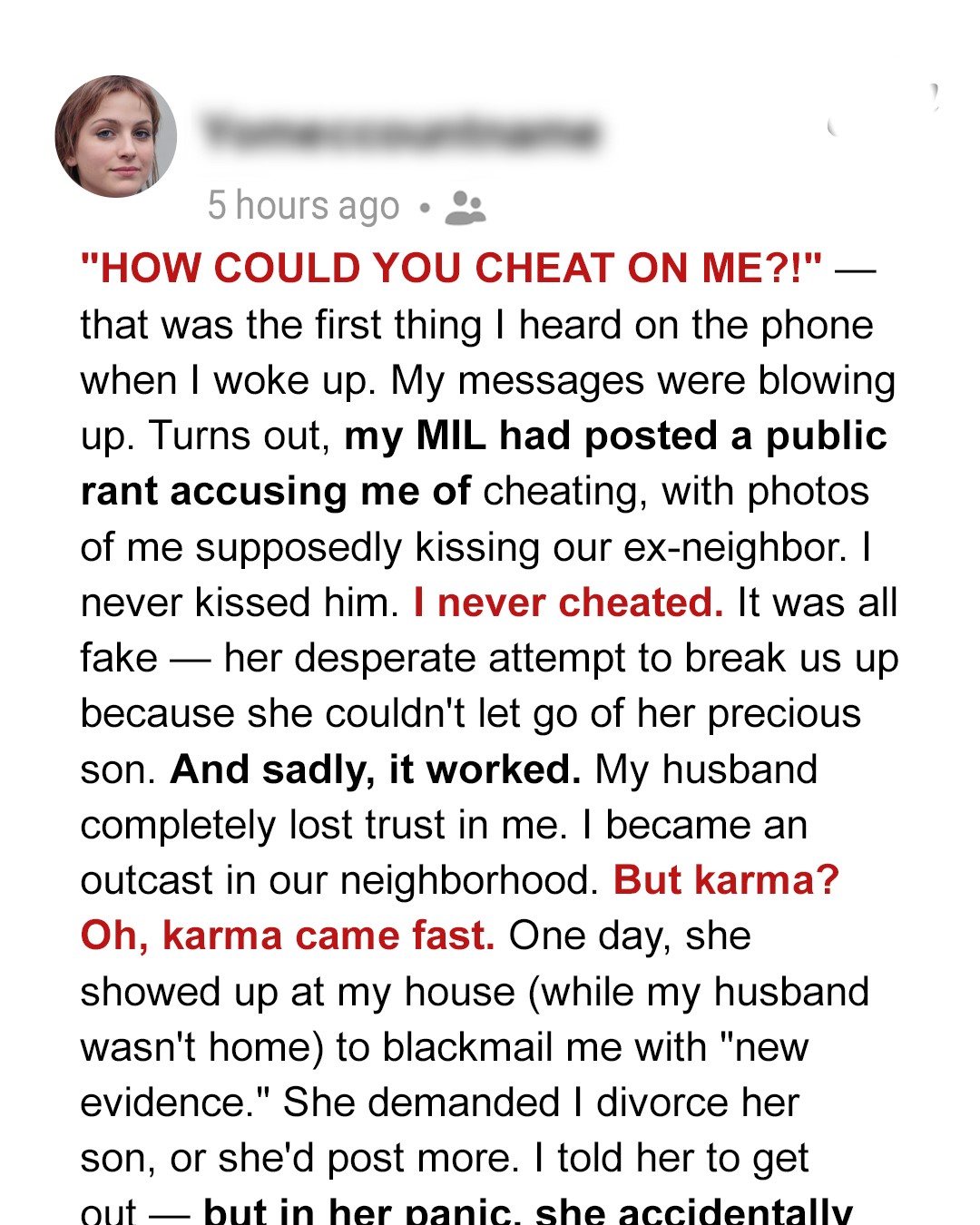 Ava’s world shatters when she wakes to her husband’s furious call — her MIL has posted fake photos online, accusing her of cheating. As neighbors turn cold and her marriage teeters, Ava must prove the truth before lies destroy everything. But karma’s watching, and it’s got receipts.I’d just crawled into bed after an exhausting night shift at the hospital when my phone started vibrating like it had a personal vendetta against my nightstand.