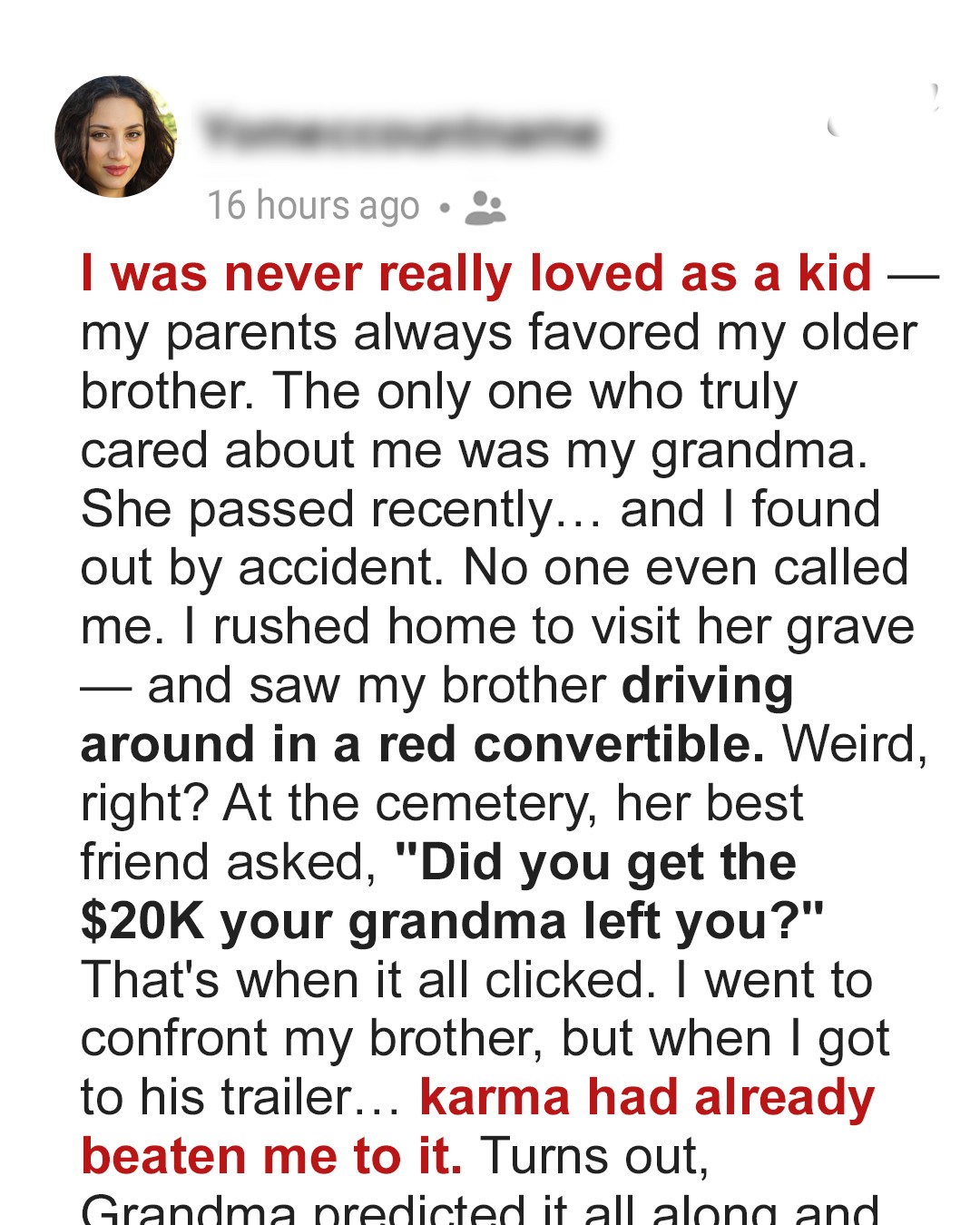 When I saw my brother cruising around in a shiny red convertible, I knew something was off. Little did I know, that car held the key to a betrayal I never saw coming — and a plan Gran had set in motion long before she was gone.My name is Juniper. I’m 26 now, and I’ve been living out of state for four years. Honestly, it was the best decision I ever made: to get away from my family and all the hurt that came with it.