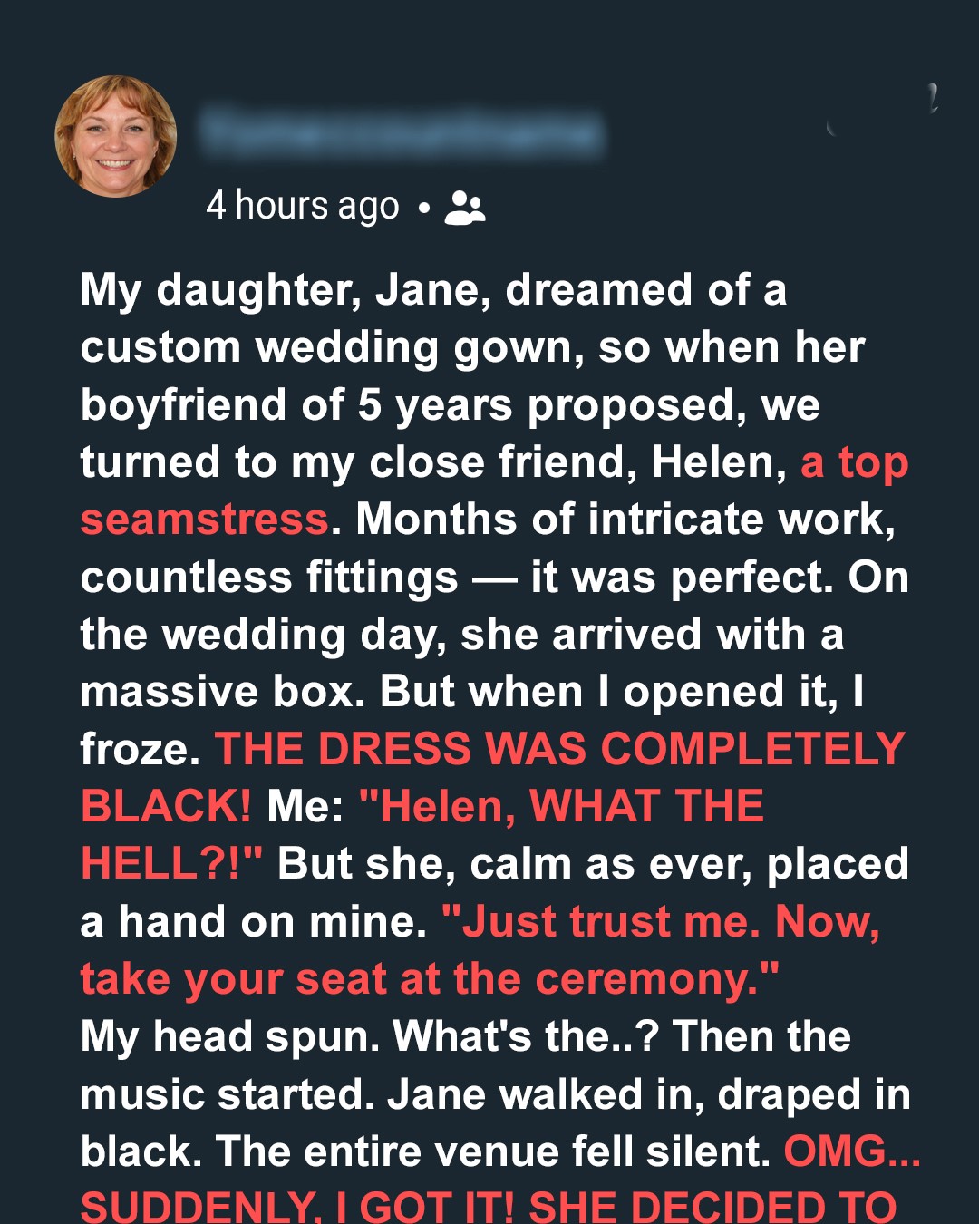 From that moment on, the wedding planning took over our lives. And the first thing we decided on was the dress.Jane had always dreamed of something unique. Nothing off the rack. It had to be custom-made, just for her. Luckily, my best friend, Helen, was one of the most talented seamstresses in town.“Oh, we’re gonna make her look like a queen,” Helen had said, sketching the first designs.For months, she worked on it. She poured her heart into every stitch, every bead, every delicate fold of fabric. It was time-consuming and expensive, but it was perfect.