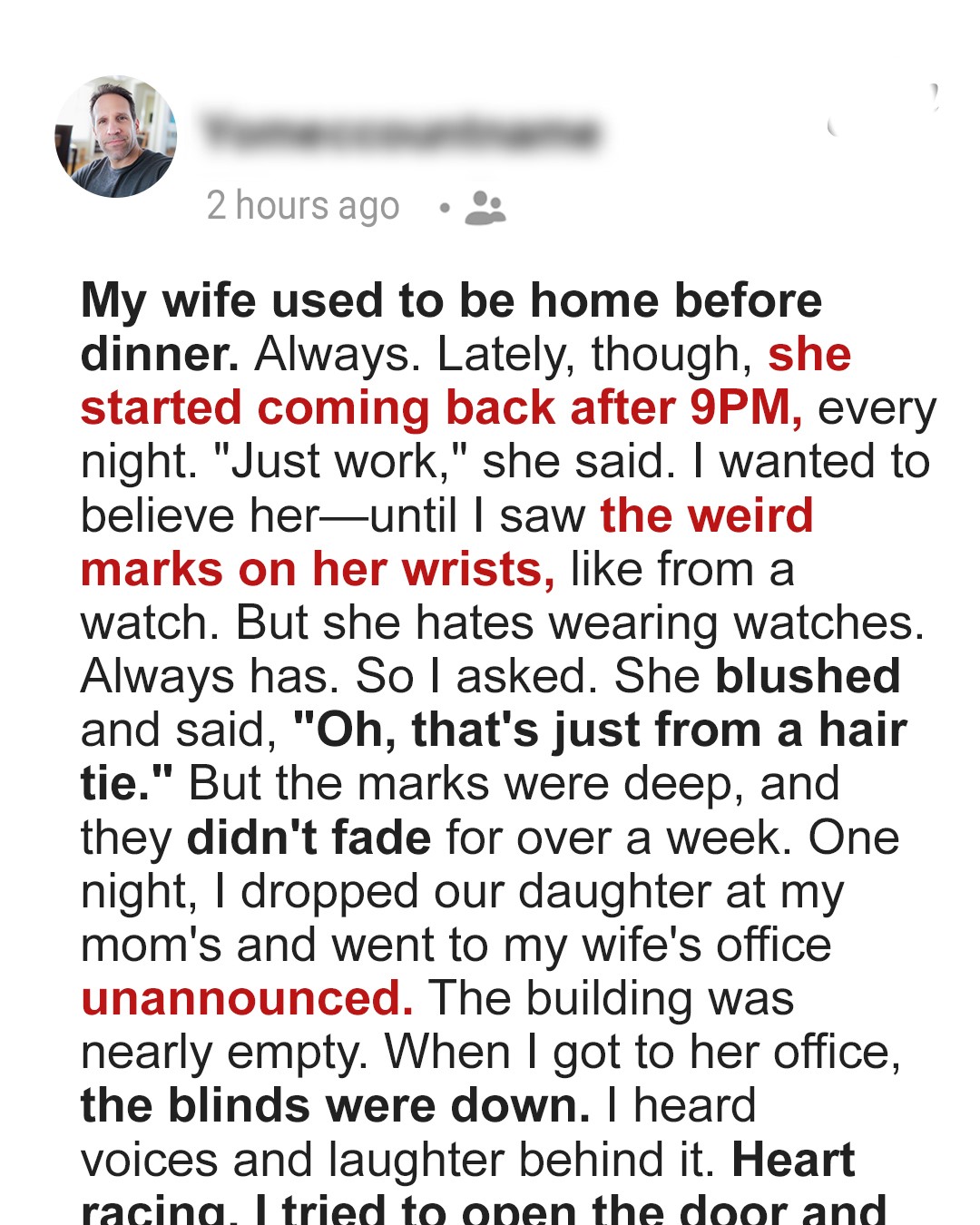 When Jonathan’s wife starts coming home late with strange marks on her wrists, doubt begins to seep into their once-solid marriage. One unexpected visit to her office threatens to unravel everything, until a deeper truth forces him to question not her loyalty, but how much he really sees the woman he loves.My wife used to be home before dinner.Always.Even when things were hectic at work, Nara made it home in time to eat with us, help Lena with her homework, and maybe squeeze in one of those murder mystery shows she swore she didn’t like.