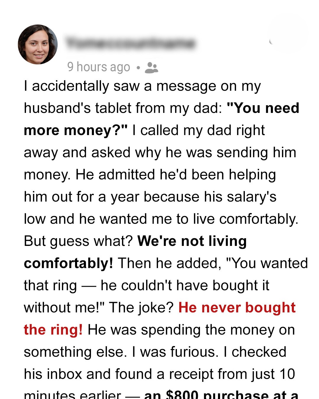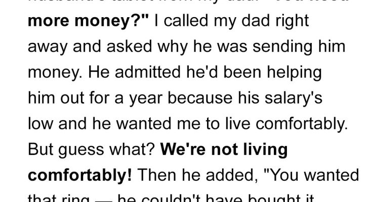 “I lied to your dad,” my husband said. His voice didn’t tremble but I could feel the tension under each word. “I told him I needed help so we could stay afloat. For groceries. Bills. Rent. I made it sound like we were struggling.”